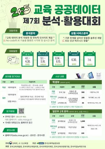 참가 신청은 4월 1일(화)부터 4월 30일(수)까지 교육 공공데이터 분석·활용대회 누리집에서 온라인으로 가능하며, 5∼6월 1·2차 심사를 거쳐 학생부 52개팀, 일반부 12개팀 최종 64개 수상팀(또는 개인)을 선발한다.
