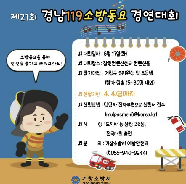 [경남도민뉴스=백형찬 기자] 거창소방서는 오는 6월 17일(예정) 창원컨벤션센터에서 열리는 『제21회 경남 119소방동요 경연대회』의 참가 신청을 4월 4일까지 접수한다고 밝혔다.