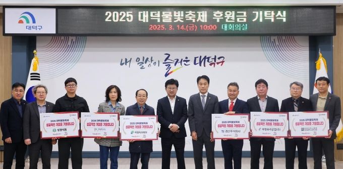 최충규 대덕구청장은 “어려운 여건 속에서도‘대덕물빛축제’의 성공 개최를 위해 후원에 동참하는 기업들이 매년 늘어나고 있다. 함께해주시는 모든 기업에 감사드린다”라며 “‘2025 대덕물빛축제’가 방문객과 지역민들이 제대로 즐길 수 있고, 나아가 지역 경제 활성화를 견인할 수 있도록 철저히 준비하겠다”라고 전했다.