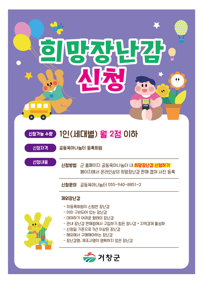 거창군 공동육아나눔터 등록회원이면 누구나 신청할 수 있으며, 군 홈페이지 공동육아나눔터란의 ‘희망장난감 신청’ 게시판을 통해 간편하게 신청하면 된다.