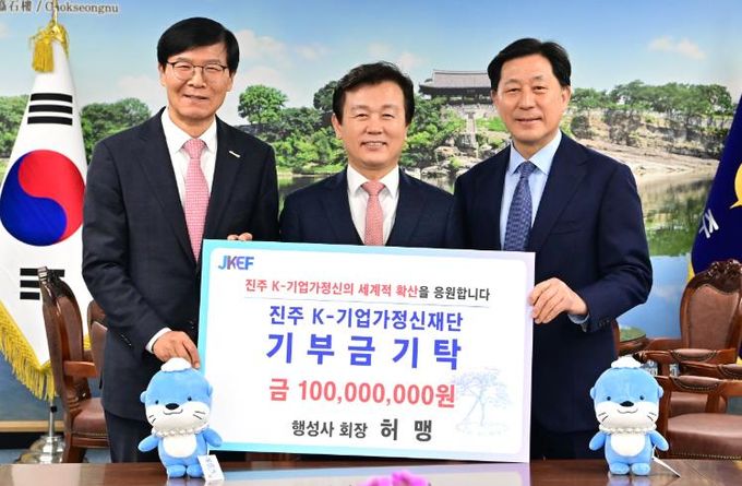 이날 기탁식에는 조규일 진주시장, 허맹 ㈜행성사 회장, 김종욱 진주 K-기업가정신재단 회장, 조복래 진주 K-기업가정신재단 사무총장 등 10여 명이 함께했다.
