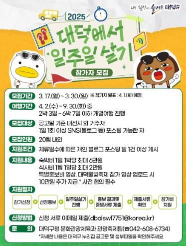 [경남도민뉴스=도문호 기자] 대전 대덕구는 오는 30일까지 ‘2025 대덕에서 일주일 살기’ 참가자를 모집한다고 밝혔다.
