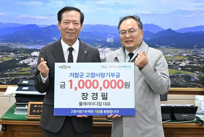 [경남도민뉴스=백형찬 기자] 거창군은 플레이미디컴(경기도 고양시 소재)의 장경필 대표가 고향사랑기부금 100만 원을 기부했다고 19일 전했다.