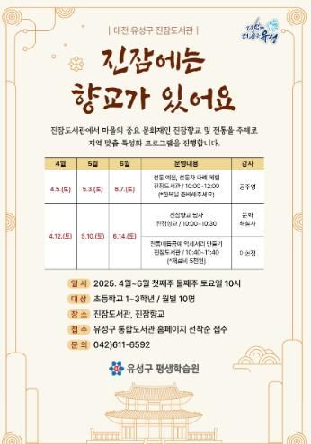 정용래 유성구청장은 “선비의 고장 진잠에서 다양한 전통문화를 직접 체험할 수 있는 기회가 될 것”이라며 "앞으로도 지역사회 상생 문화 프로그램을 운영해 지역 도서관이 문화 거점 역할을 하는 데 주력하겠다"고 말했다.
