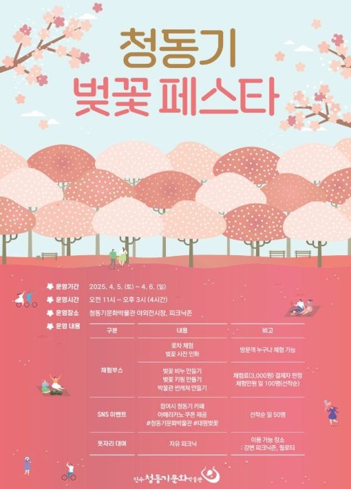 ‘청동기 벚꽃 페스타’는 대평 벚꽃 드라이브 후 박물관을 방문하는 시민들을 대상으로 꽃차 체험, 벚꽃 키링 만들기, 박물관 썬캐처 만들기, 벚꽃 비누 만들기, 방문 후기 이벤트 등 다양한 즐길거리를 제공한다.