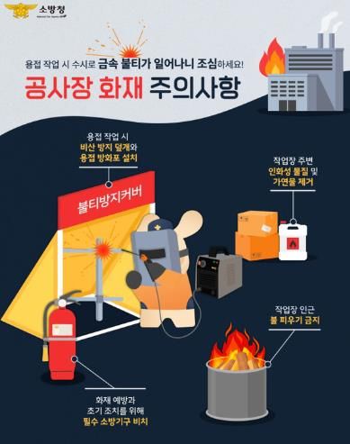 화재 예방수칙으로는 ▲용접 등 화재 취급 작업 시 화재감시자 지정 배치 ▲용접ㆍ용단 작업자로부터 반경 5m 이내 소화기 비치 ▲작업장 주변 반경 10m 이내 가연물 적치 금지 ▲가연물 주변에서 흡연 금지 ▲용접 작업 후 작업장 주변 불씨 여부 확인 등이 있다.
