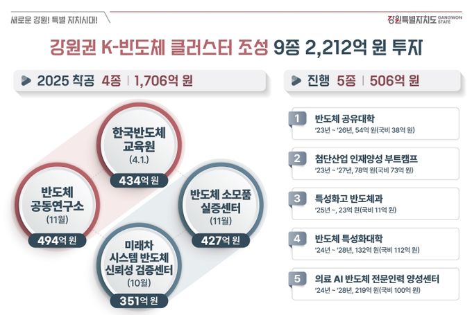 [경남도민뉴스=류종길 기자] 강원특별자치도는 ‘강원권 K-반도체 클러스터’ 조성을 위해 9종 2,212억 원을 투입하고 있으며, 이 중 4개 사업이 올해 본격적으로 착공에 들어갈 예정이라고 밝혔다.