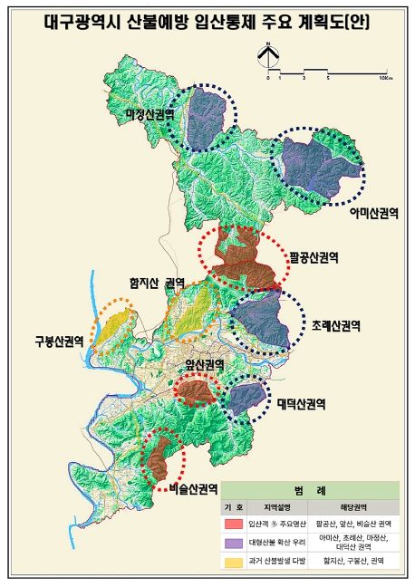 적용되는 구역은 △팔공산, 앞산, 비슬산 등 입산객이 많은 주요명산 구역 △아미산, 초례산, 마정산, 대덕산 등 산불발생 시 대형화 위험이 큰 구역 △함지산, 구봉산 등 과거 산불 발생 구역의 산림에 대하여 적용된다.