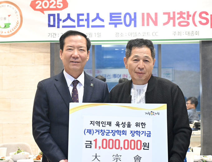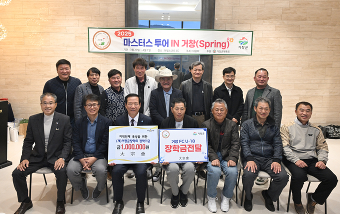[경남도민뉴스=백형찬 기자] (재)거창군장학회는 지난 31일 지역인재 육성을 위해 대종회(大宗會)에서 ‘2025 마스터스 투어 In 거창(Spring)’ 경기 중 회원들이 모은 성금 100만 원을 장학회에 기탁했다고 밝혔다.