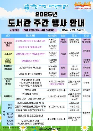 [경남도민뉴스=최민숙 기자] 칠곡군 군립도서관은 ‘도서관의 날․도서관 주간’을 맞아 4월 한 달간 “꿈을 키우는 씨앗, 도서관에 묻다”를 주제로 도서관의 가치와 역할을 알리고, 지역 주민들이 독서문화를 향유할 수 있도록 다양한 행사를 운영한다.