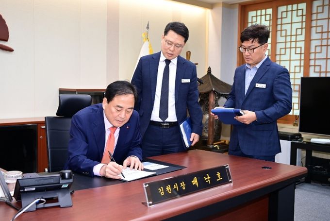 [경남도민뉴스=최민숙 기자] 오랜 기간 내홍으로 표류하던 민선 8기 김천호의 선장이 지난 4월 2일 배낙호 시장으로 새롭게 결정됐다. 당선증을 교부받은 배낙호 김천시장은 취임 첫날인 4월 3일 집무실에서 ‘지역경제 氣살리기 프로젝트 추진’ 사항을 공식 1호 결재로 서명했다.