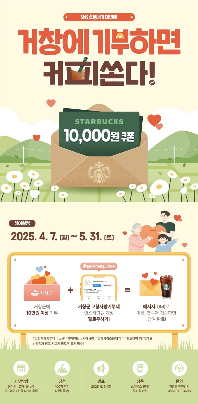 이벤트는 4월 7일부터 5월 31일 기간 중 거창군에 10만 원 이상 기부한 기부자를 대상으로 1만 원 상당의 커피 쿠폰을 추가로 증정하며, 무작위 추첨으로 당첨자 100명을 선정할 예정이다.
