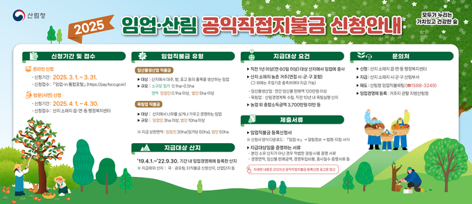 [경남도민뉴스=백형찬 기자] 거창군은 오는 4월 30일까지 2025년 임업·산림 공익직접지불금(이하 ‘임업직불금’) 방문 신청·접수를 진행한다.