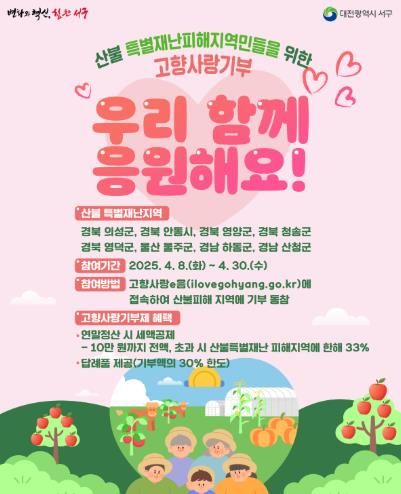 서철모 구청장은 “서구는 산불로 고통받는 지역 주민들을 돕기 위해 고향사랑기부제 홍보를 포함, 다양한 방식으로 노력하고 있다. 이번 캠페인이 이재민들에게 조금이나마 위로와 도움이 되길 바란다”고 말했다.