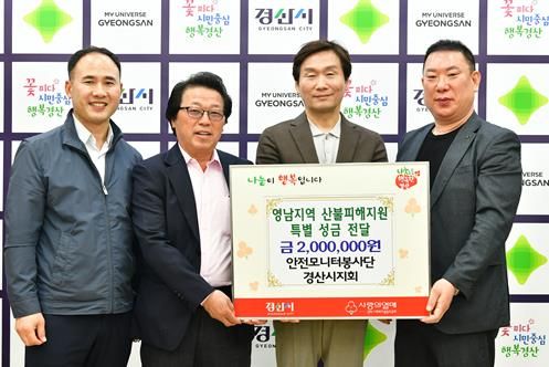 [경남도민뉴스=최민숙 기자] 안전모니터봉사단 경산시지회에서 16일 경산시청을 방문하여 산불로 큰 피해를 입은 주민들을 돕기 위해 성금 200만원을 기탁 했다.