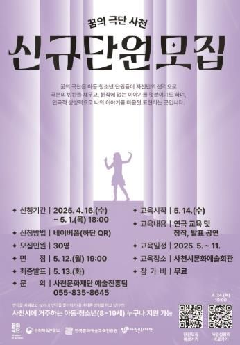 [경남도민뉴스=변정형 기자] 사천문화재단은 오는 5월 1일까지 ‘2025 꿈의 극단 사천’ 신규 단원을 모집한다.