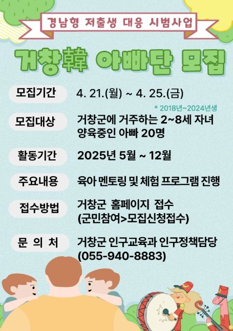 [경남도민뉴스=백형찬 기자] 거창군은 경상남도의 ‘100인의 아빠단’을 시군으로 확대 운영하는 ‘경남 400인의 아빠단’ 사업에 따라 아빠들의 육아 참여와 가족 가치 인식 제고를 위한 ‘거창한(韓) 아빠단’을 모집한다고 밝혔다.