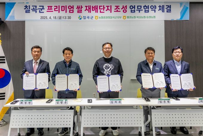 [경남도민뉴스=최민숙 기자] 칠곡군은 18일 농업기술센터에서 농협중앙회칠곡군지부, 왜관·북삼·동명 지역농업협동조합과 함께 프리미엄 쌀 재배단지 조성 사업의 성공적인 추진을 위한 업무협약(MOU)을 체결했다.