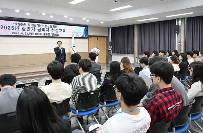 [경남도민뉴스=도문호 기자] 대전 중구는 21일 중구청 대회의실에서 공직자의 소통 능력 강화 및 친절 마인드 제고를 위해 직원 150여 명을 대상으로 ‘2025년 상반기 친절교육’을 실시했다고 밝혔다.