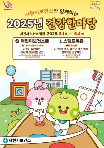 '2025년 사천시 건강한마당'은 사천시 통합30주년 기념 축제주간 및 어린이날을 맞이하여 ‘튼튼한 어린이, 건강이 자라는 날’이라는 부제로 유아와 초등학교 저학년을 대상으로 하는 어린이보건소존을 신규 운영한다.