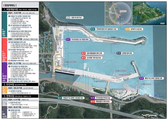 이번 사업을 통해 171억 원(국비 150억, 군비 11억, 민자 10억)을 투입해 ▲노후시설 철거 ▲보행로 조성 ▲어업인 편익시설 신축 ▲회센터 어구보수보관장 설치 등으로 어촌 생활환경과 관광 경쟁력을 동시에 강화할 예정이다.