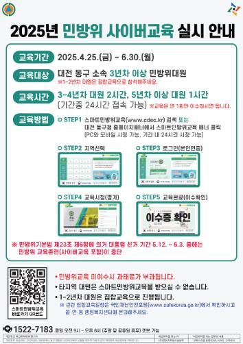 이번 사이버교육은 오는 25일부터 6월 30일까지 동구 소속 3년 차 이상 민방위대원을 대상으로 진행되며, 동구청 누리집 배너 또는 스마트민방위교육 누리집을 통해 신청할 수 있다.