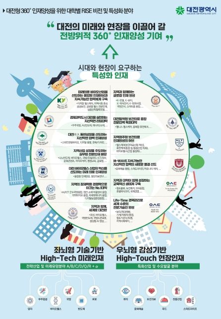 첫 번째 프로젝트인 ‘지역선도형 대학교육 특성화’는 전략산업과 미래 유망분야, 그리고 특화산업과 수요발굴 분야의 인재를 양성해 대전의 미래를 이끌 360도 인재 양성을 목표로 한다.