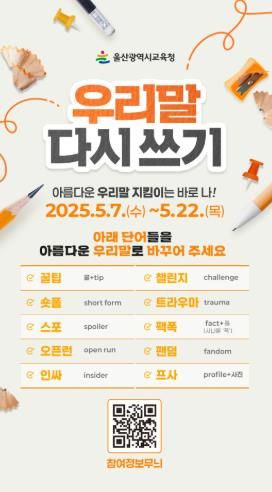 울산교육청은 참가 학생들이 제출한 우리말 표현을 심사해 우수작을 선정해 시상하고, 학교와 기관에 배포할 예정이다. 특히 올해는 참여 대상을 초등학생까지 확대했다.