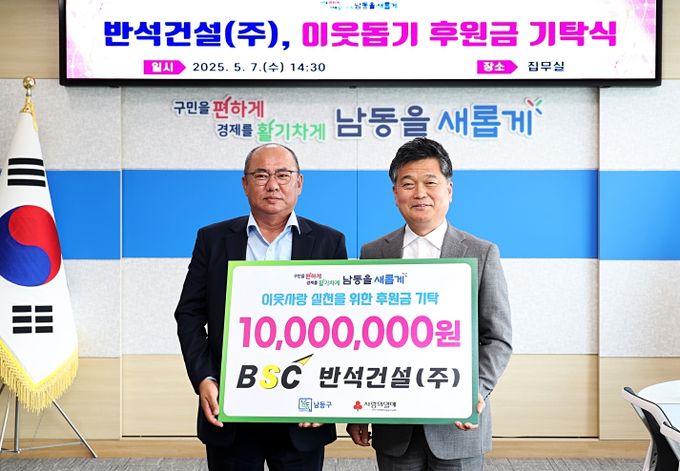 [경남도민뉴스=김용욱 기자] 인천 남동구는 반석건설 주식회사로부터 후원금 1천만 원을 기탁받았다고 9일 밝혔다.
