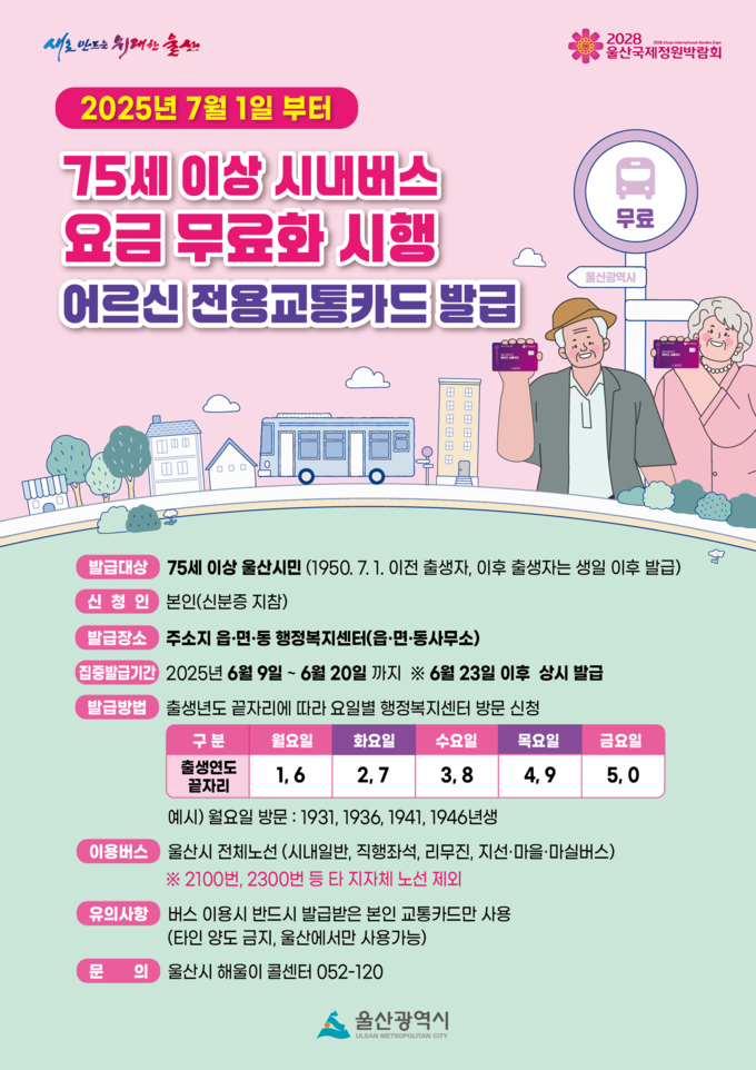 특히 울산시는 어르신들의 카드 발급 대기 시간과 혼잡을 최소화하기 위해 오는 6월 9일부터 6월 20일까지 2주간 출생연도 기준으로 요일제를 시행한다.
