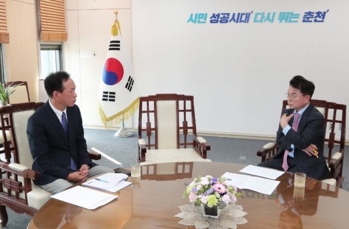 [경남도민뉴스=류종길 기자] 육동한 춘천시장이 14일 시청 접견실에서 ‘양자정보통신 산업생태계 조성사업’ 추진상황에 대해 보고받고 사업 전반의 로드맵과 향후 방향을 점검했다. 보고는 한림대학교 반도체디스플레이학과 장문규 교수가 맡았다.