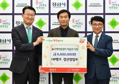 [경남도민뉴스=최민숙 기자] iM뱅크 경산영업부는 14일 경산시청을 방문하여 관내 지역아동센터 이용 아동들의 학습비 지원을 위해 성금 660만원을 기탁했다.