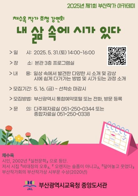 [경남도민뉴스=김채연 기자] 부산시교육청 부산광역시립중앙도서관은 오는 31일 도서관 3층 프로그램실에서 성인 및 청소년 20명을 대상으로 2025년 제1회 부산작가 아카데미 ‘내 삶 속에 시가 있다’를 운영한다.