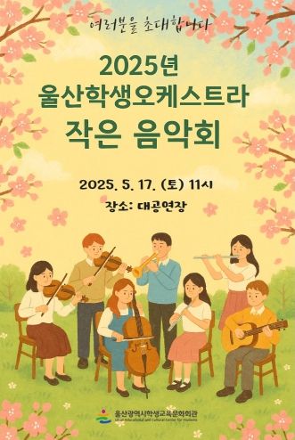 [경남도민뉴스=최재경 기자] 울산 중구 울산학생교육문화회관(관장 김현미) 소속 울산학생오케스트라가 오는 17일 오전 11시 대공연장에서 작은 음악회를 연다.