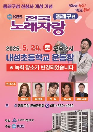 동래구는 당초 동래중학교에서 열릴 예정이었던‘KBS 전국노래자랑-동래구편’공개녹화 장소를 내성초등학교(동래로 173, 복천동)로 변경했다. 공개녹화 관람을 원하는 시민들은 내성초등학교 운동장을 방문하면 된다.