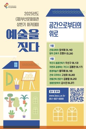 [경남도민뉴스=신석주 기자] (재)부산문화회관(대표이사 차재근)은 2025년도 상반기 아카데미 '예술을 짓다'를 선보인다. 소주제 중 하나인 ‘공간으로부터의 위로’에서는 건축, 조경, 정원분야를 다룬다. 총 8개의 강연을 통해 주변 공간에서의 예술이 가진 치유, 회복력을 경험하는 소중한 시간을 선사한다.