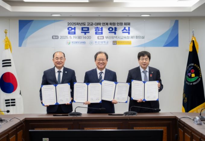 [경남도민뉴스=김채연 기자] 부산광역시교육청은 19일 오후 2시 교육청 제1회의실에서 부산대학교, 부산외국어대학교와 ‘2025학년도 고교-대학 연계 학점 인정 체제 업무 협약’을 체결했다.