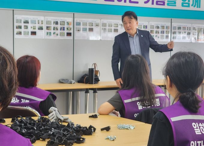 20일 진천 충북테크노폴리스 태양광기술센터에 마련된 ‘일하는 기쁨’ 작업장을 방문한 김 지사는 참여자들의 목소리를 듣고 “도민이 실제로 체감할 수 있는 실효성 있는 정책을 추진하겠다”고 밝혔다.