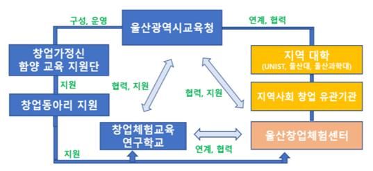 울산교육청은 울산고등학교를 창업체험교육 연구학교로 지정하고, 울산창업체험센터, 창업가정신 함양 교육 지원단, 지역 대학(울산과학기술원, 울산대학교, 울산과학대학교)과 창업지원 기관과 연계해 교육 생태계를 조성하고 있다.
