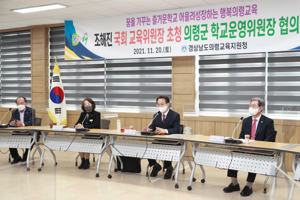 [경남도민뉴스] 국회 교육위원장인 조해진 국회의원(밀양․의령․창녕․함안)이 20일 의령교육지원청을 찾아 오태완 의령군수와 문봉도 의령군의회 의장, 손태영 도의원, 한금조 의령교육장을 비롯해 의령지역 초, 중학교운영위원장(회장 주웅일)들과 의령교육 발전을 위한 간담회를 가졌다.