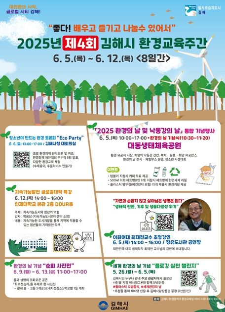 [경남도민뉴스=최미정 기자] 김해시는 환경의 날(6.5.)을 기념해 오는 6월 5일부터 12일까지 8일간 ‘제4회 김해시 환경교육주간’을 운영한다고 23일 밝혔다.