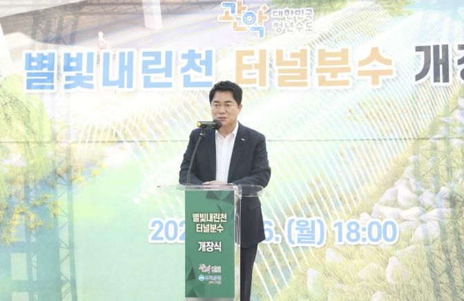 새롭게 단장한 수경시설은 터널분수 형태로 별빛내린천 수변무대 일대에 길이 20m, 폭 17.5m 규모로 조성됐다. 수중펌프와 밸브를 이용한 다채로운 물줄기 연출과 야간 경관조명이 어우러져 주민들에게 시각적 볼거리를 더했다.