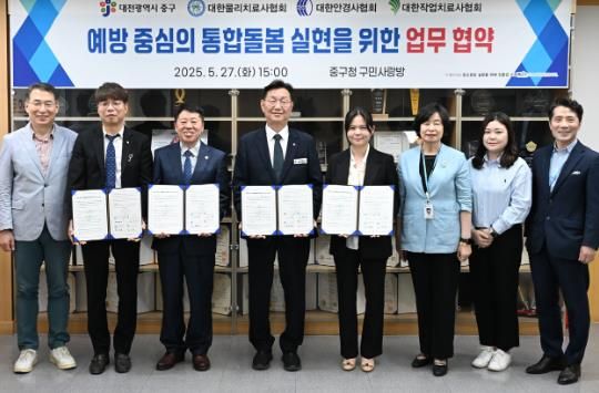 김제선 중구청장은 “이번 협약을 통해 지역 내 건강 사각지대를 해소하고, 전문적이고 선제적인 방문재활서비스를 제공할 수 있을 것”이라며 “앞으로도 지역사회가 함께 주민의 건강을 돌보는 지속가능한 통합돌봄체계를 적극 구축해 나가겠다”라고 밝혔다.