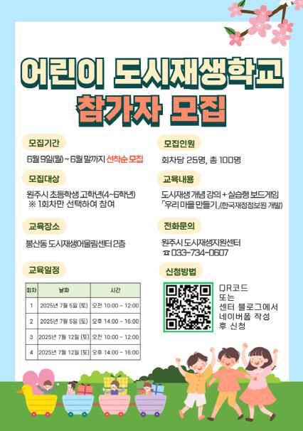 [경남도민뉴스= 기자] 원주시 도시재생지원센터는 초등학교 고학년 어린이(4~6학년)를 대상으로 도시재생을 쉽고 재미있게 배울 수 있는 체험교육 프로그램 ‘2025 어린이 도시재생학교’의 참가자를 모집한다.