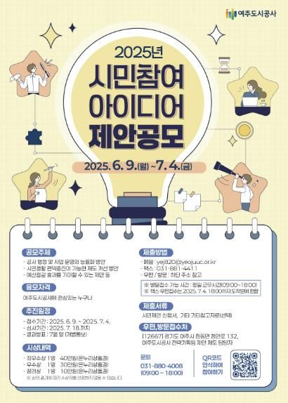 [경남도민뉴스= 기자] 여주도시공사는 오는 6월 9일부터 ‘2025년 시민참여 아이디어 제안 공모’를 진행한다고 밝혔다. 이번 공모는 시민과 함께하는 열린 행정 실현과 공사 사업의 지속 가능한 발전을 도모하기 위해 마련됐다.