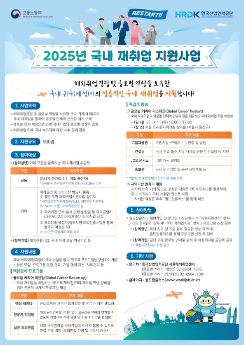 ‘국내 재취업지원사업’은 올해부터 정식사업으로 확대된다. 맞춤형 역량강화 프로그램 ‘글로벌 커리어 리턴업’과 일자리 매칭 박람회인 ‘글로벌 커리어 리스타트’로 구성된다.