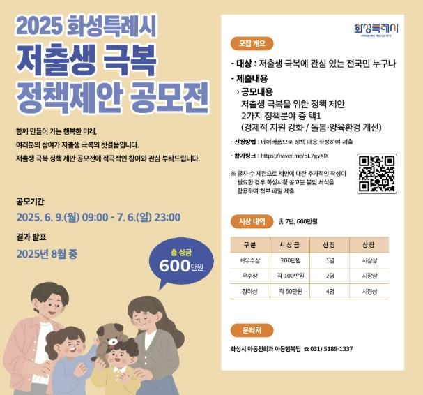 [경남도민뉴스= 기자] 화성특례시가 저출생 문제 해결을 위한 시민들의 창의적인 아이디어를 발굴하고자 ‘2025년 화성시 저출생 극복 정책 제안 공모전’을 개최한다.
