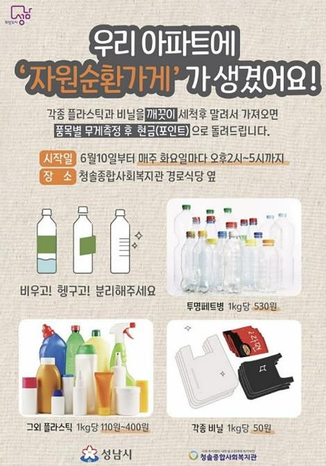 [경남도민뉴스= 기자] 성남시는 재활용 가능한 쓰레기를 가져오면 현금처럼 쓸 수 있는 포인트를 적립해 주는 ‘자원순환가게’를 분당구 금곡동 청솔종합사회복지관 옆에 추가 설치해 10일 문을 열었다.