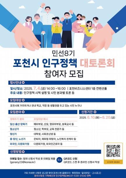 시민들은 생애주기별 분과로 나뉘어 생활 현장에서 체감하는 인구 문제를 논의하고, 정책 제안까지 직접 참여하게 된다. 실효성 있는 인구정책 발굴은 물론, 포천시의 지속 가능한 미래를 시민과 함께 그려가는 소통과 협력의 자리가 될 것으로 기대된다.