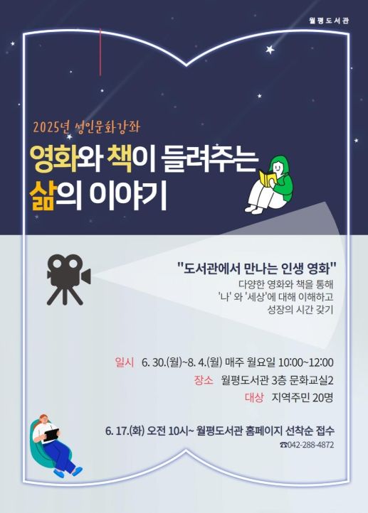 [경남도민뉴스= 기자] 대전 서구 월평도서관은 성인을 대상으로 한 문화 강좌인 ‘영화와 책이 들려주는 삶의 이야기’를 6월 30일부터 8월 4일까지 운영한다.